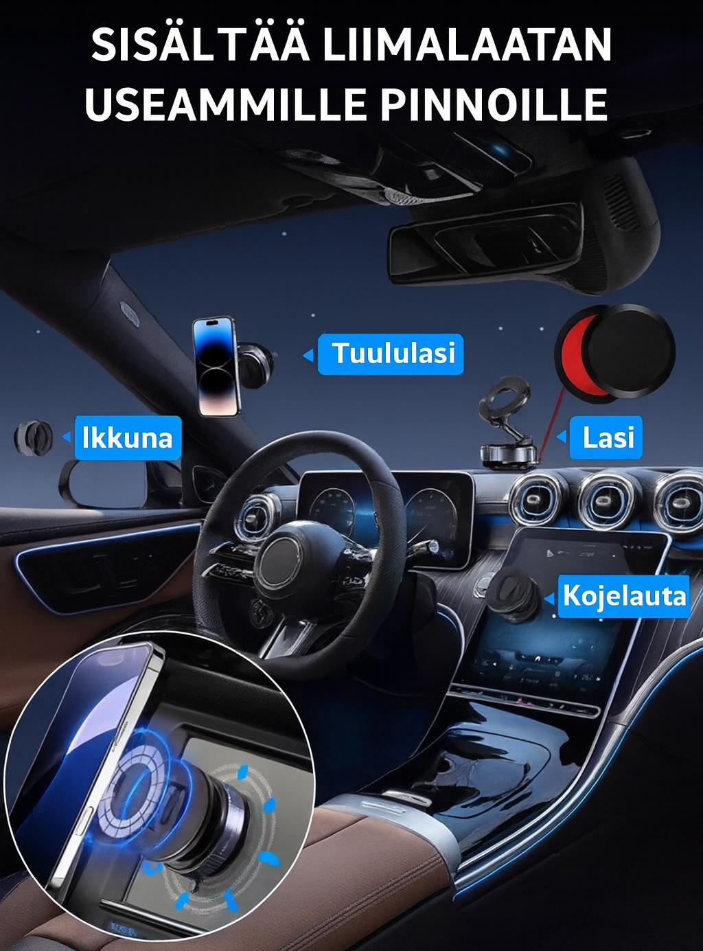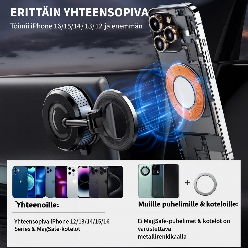 Yhteensopivuus: iPhone 12–16 (MagSafe) sekä muut mallit universaalirenkaan avulla