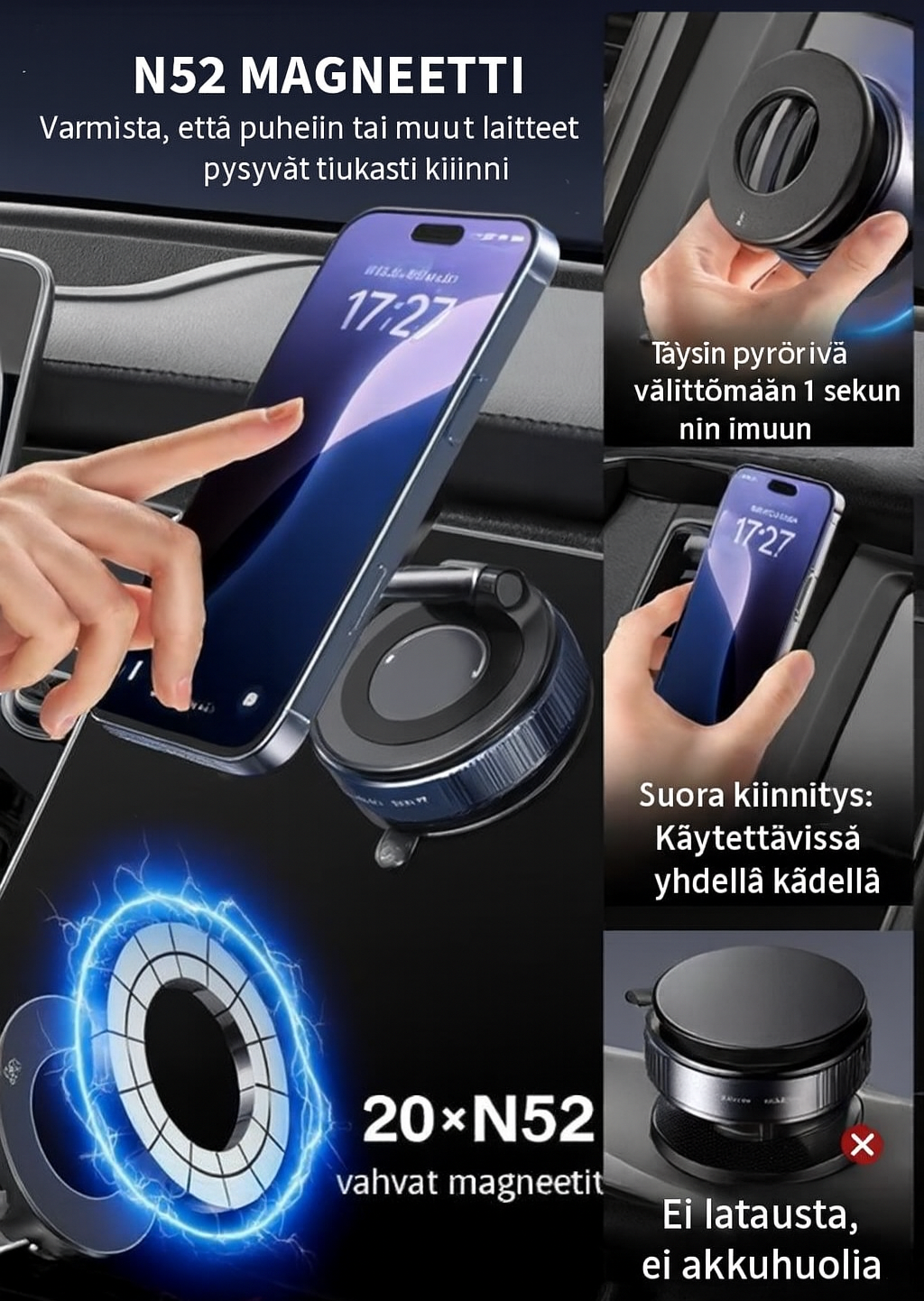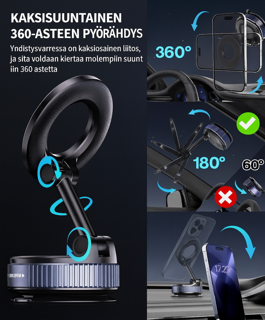 Jätä hyvästit epävakailla puhelintelineille, jotka irtoavat helposti. Tämä teline takaa täydellisen vakauden yhdistämällä tehokkaat N55-magneetit ja innovatiivisen One-Twist -tyhjiöimukupin. Älypuhelimesi pysyy tukevasti paikoillaan myös kuoppaisilla teillä ja jyrkissä kaarteissa, jotta voit keskittyä täysin ajamiseen.