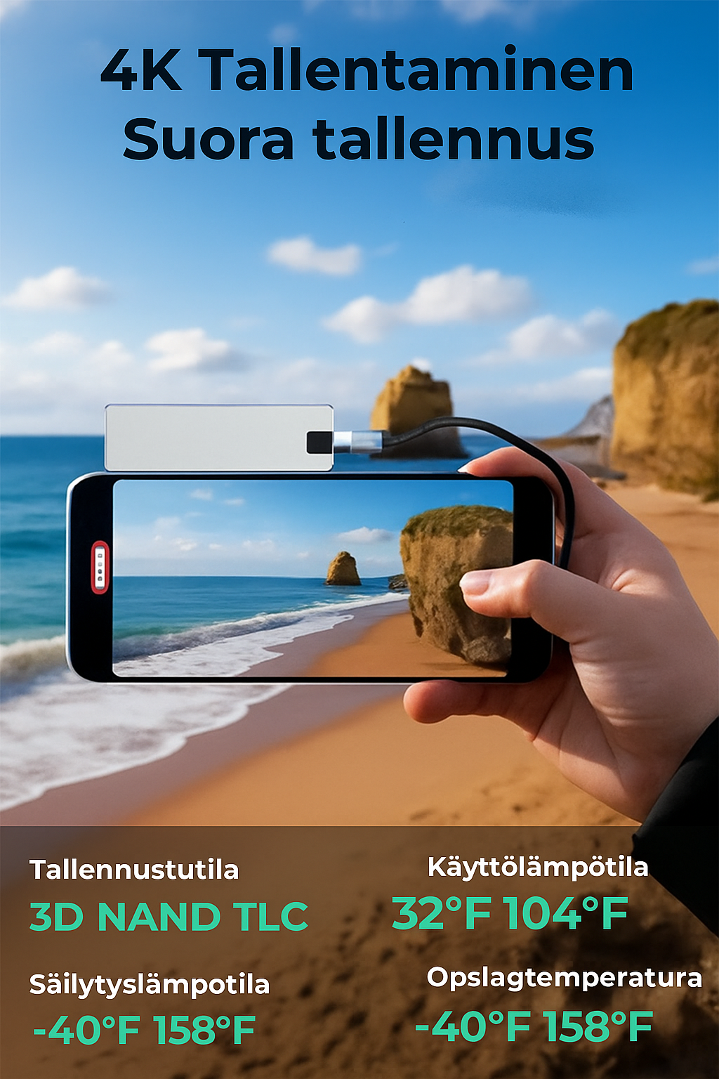 Älykäs taitettava muotoilu tekee tästä muistitikusta kompaktin ja helposti mukana kulkevan. Se tarjoaa turvallisen tavan tallentaa ja varmuuskopioida valokuvia, videoita, asiakirjoja ja yhteystietoja missä tahansa oletkin. Tämä on monipuolinen, kannettava ja luotettava ratkaisu, joka pitää datasi järjestyksessä ja helposti saavutettavana joka tilanteessa.