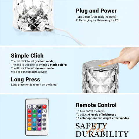 Tuo kotiisi modernia ylellisyyttä tämän ainutlaatuisen timanttikuvioisen lampun avulla. Erityinen 3D-valotehoste heijastaa kauniin ruusukuvion pöydälle tai työpöydälle. Kristallinkirkas, timanttileikattu pinta luo heti romanttisen tunnelman ja antaa jokaiselle huoneelle ylellisen ilmeen.