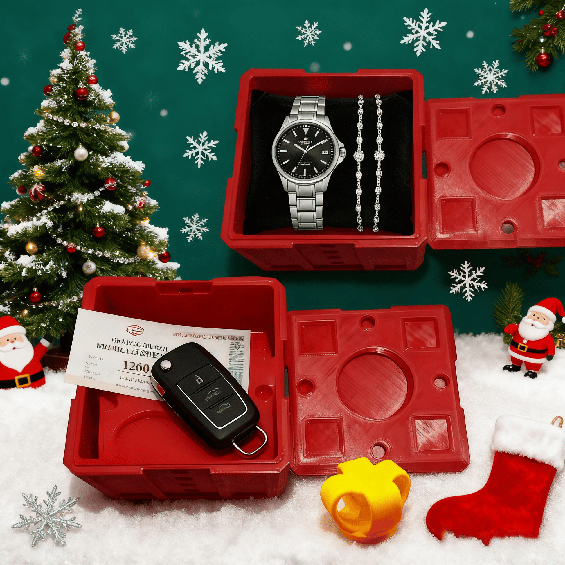 Laatikon avaaminen on itsessään leikkisä pieni pulma. Mekanismi toimii kierrelukolla, mutta ennen sitä saajan täytyy löytää nauhan alle kätketty avain. Sen jälkeen useita ruuveja on avattava yksi kerrallaan. Tämä nerokas rakenne lisää jännitystä ja odotusta, tehden lahjan avaamisesta erityisen interaktiivisen ja hauskan kokemuksen.